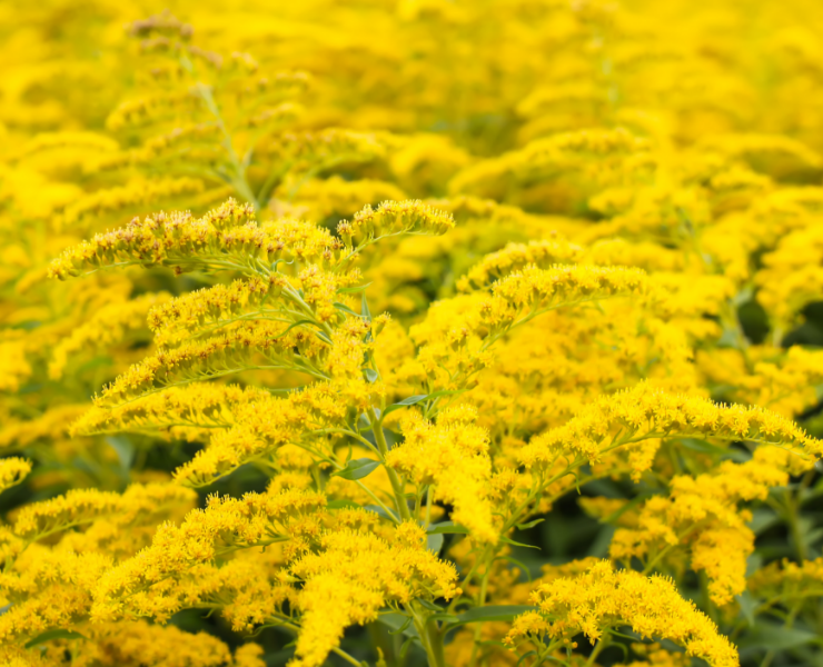 Goldenrod – small, scentless yellow flowers that last throughout the summer. It has semi-double blooms and grows neat and bushy. It is ideal for patios, cottage gardens or cut flower gardens. Make sure to place it in full sun and it will flower from July to September.